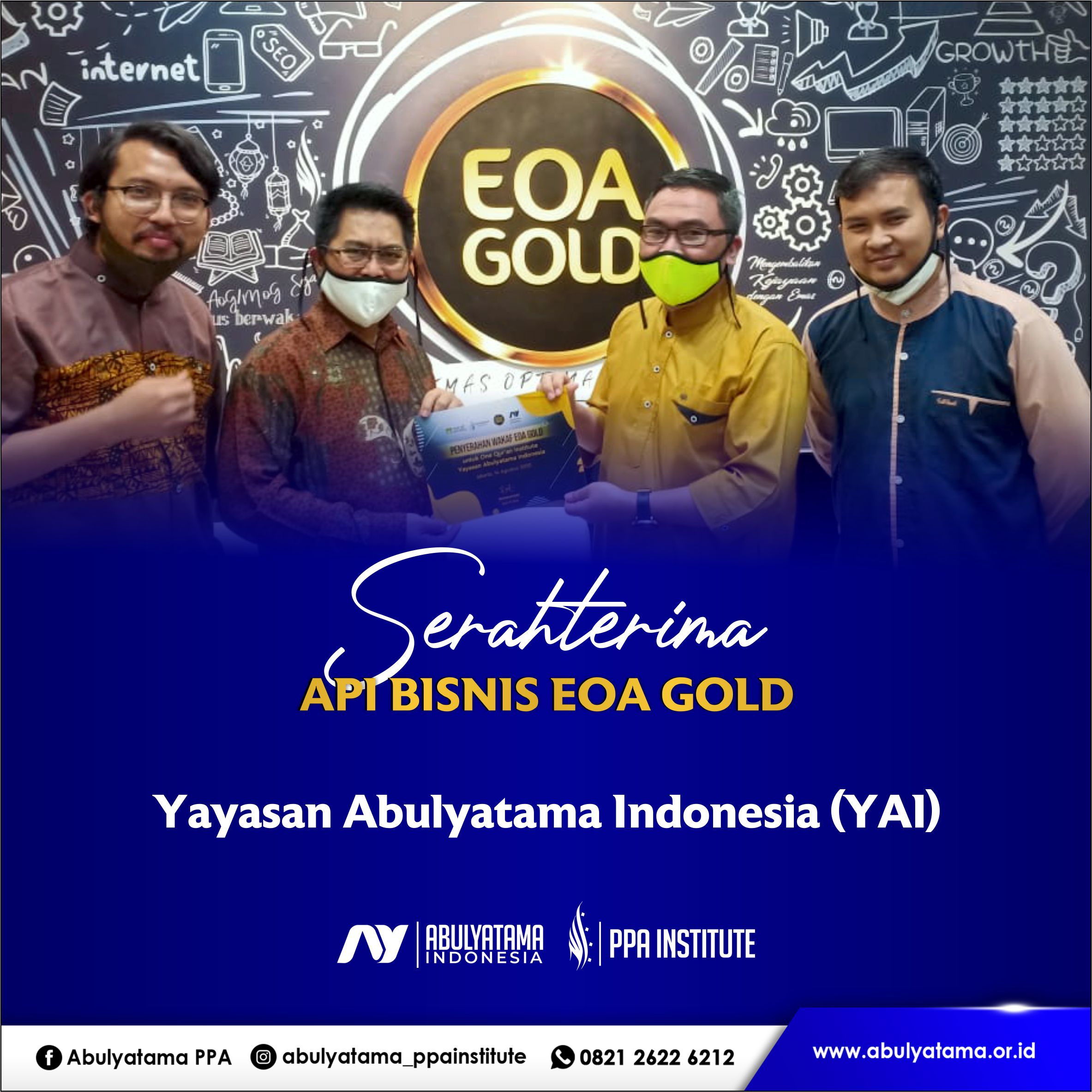 Oleh karena itu, dalam rangka menunaikan API bisnis EOA Gold, Alhamdulillah pada Hari Jum'at, 14 Agustus 2020, telah dilaksanakan serah terima API bisnis EOA Gold untuk Majelis Ulama Indonesia (MUI) dan Yayasan Abulyatama Indonesia (YAI). Bertempat di Kantor Pusat EOA Gold, kegiatan ini dihadiri oleh Ustadz Rofik (MUI), Rochmayadie, S.E. (EOA Gold), Sudarmanto, Kamaludin Syakir, Maradoli Matondang, dan Ust. Zaenal (YAI). Dihadiri pula oleh Founder PPA Institute yaitu Rezha Rendy.