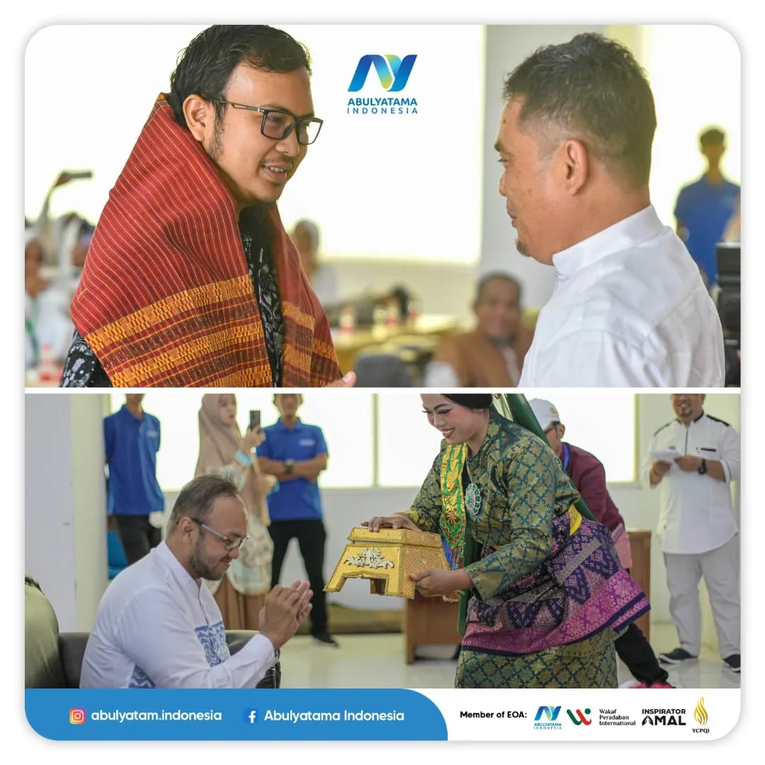 Disambut dengan tarian khas Medan serta pemberian kain ulos dari dr. Alwi Mujahit Hasibuan, kepada para guru yang hadir - Sudarmanto (Ketua LAZ Abulyatama Indonesia), Kamaludin Syakir (Sekretaris), Rezha Rendy (Dewan Pembina), Ustadz Muhtar Fatony (Ketua Dewan Syuro Peradaban), dan Ruli Renata.